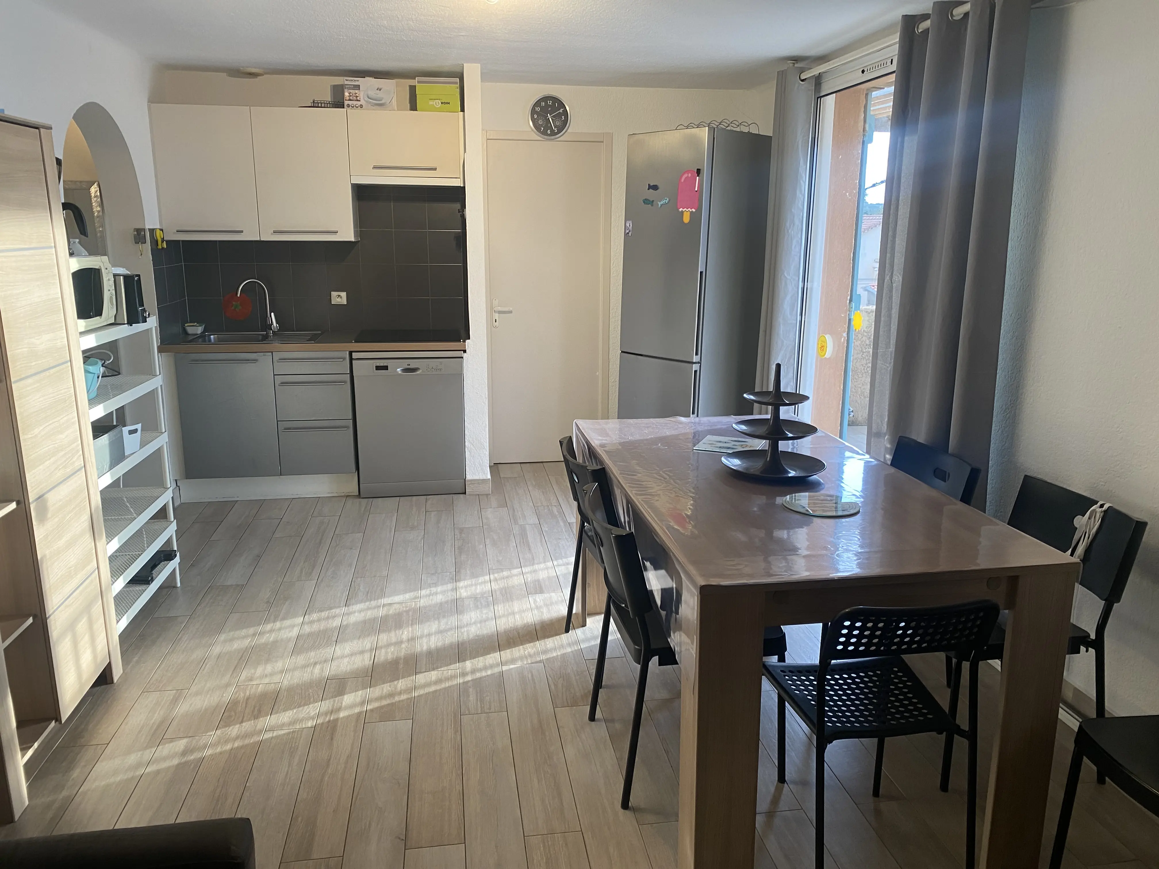 Au 2eme étage orienté ouest avec de beaux couchers de soleil sur une terrasse de 11 m2 équipée pour les repas, l'appartement est composé d'une pièce de vie avec canapé lit en 140, TV TNT, coin salon et rangements, kitchenette équipée de plaque vitro céramique, micro ondes, lave vaisselle, grand réfrigérateur congélateur et climatisation réversible.